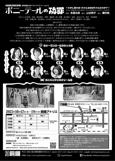 銅鑼は創立以来、「青少年に豊かな文化を」との願いから学校(芸術鑑賞教室)、おやこ劇場などで上演してきました。近年、授業数の確保、生徒数の減少、経済的状況などが重なり、実施数が激減、また予算も低額化しており、演劇の上演ではなく映画鑑賞やまた、芸術を鑑賞する行事自体なくなっている状況です。しかし、予算は少ないが演劇を生徒に見せたい、子どもたちに見せたいと思う熱心な先生、親御さんはいます。今回は上演の機会が増やせるよう、出演者5名で音響、照明等も操作し、巡演していくことを目的としています。