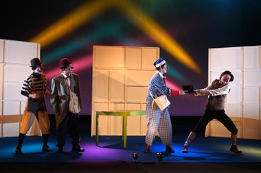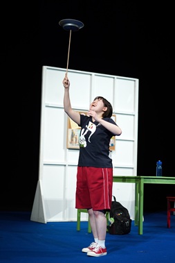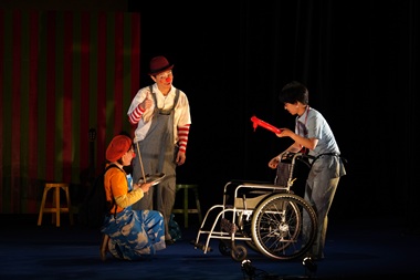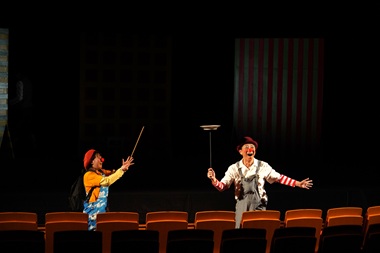 ワクワクしながら開幕の瞬間を待つ。クラウンに扮した役者たちが、笑顔で芸を披露しながら登場!これから、どんなことがおきるのだろう? 期待が膨らむ! 鑑賞準備「完了!」